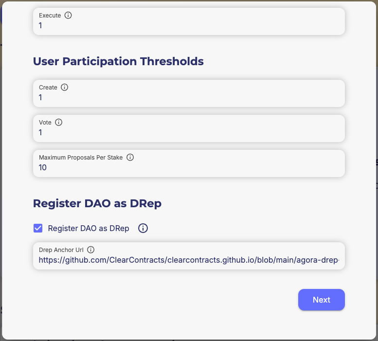 Note that the DAO can only be registered as a DRep during the initial creation. You cannot create your DAO and then later go back and register it as a DRep.
